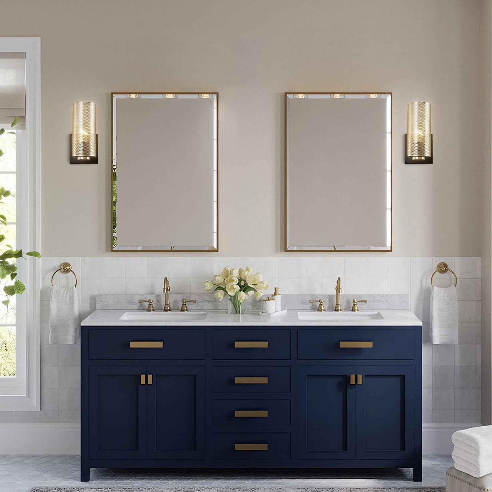 The golden metal frame is sturdy and durable, and the glass lampshade is smooth and transparent. The overall texture is excellent, which enhances the level of the bathroom.